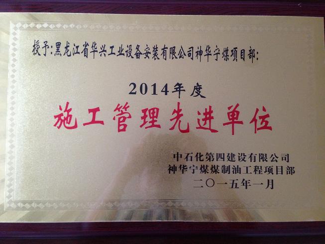 今年一月份,中石化第四建設有限公司授予我公司神華寧煤項目部“施工管理先進單位”。